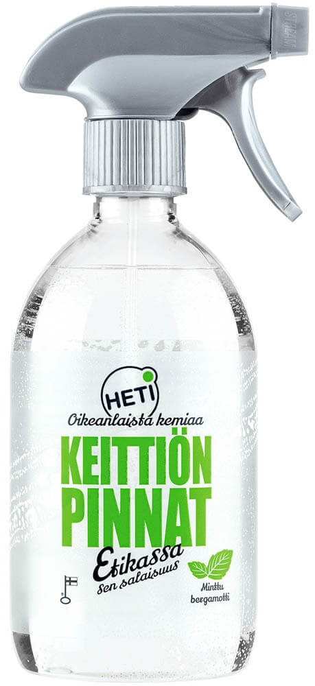 Keittiönpintojen puhdistukseen kehitetty käyttövalmis, etikkapohjainen HETI-pesuaine on kiireisen arkisiivoojan pelastus. Suihkauta ja pyyhi – saat rasvan ja lian helposti pois työtasoilta, liedeltä, tiskipöydältä ja kaapinovista. HETI-puhdistusaine poistaa tehokkaasti myös sormenjäljet rosteripinnoilta.