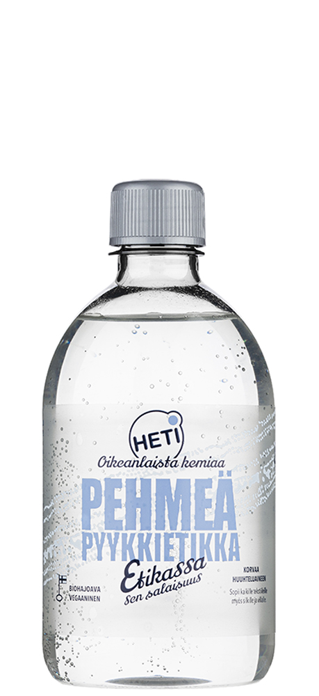 Kotimaista Rajamäen väkiviinaetikkaa sisältävä HETI-pyykkietikka korvaa huuhteluaineen. Käyttövalmiit pyykkietikat sopivat kaikille materiaaleille. Ne poistavat vaatteista vaikeitakin tunkkaisia hajuja, kirkastavat värejä ja suojaavat vaatekuituja. Ihanan lopputuloksen viimeistelee raikas tuoksu.
