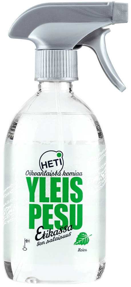 Heti Yleispesu sisältää kotimaista Rajamäen väkiviinaetikkaa, joka puhdistaa tehokkaasti ja neutralisoi tunkkaisia hajuja. Yleispesu sopii kaikkien pintojen, myös tekstiilisten puhdistukseen ja tahranpoistoon. Pyyhi huoletta kalusteet, ovet, ovenpielet ja lamput. Jos puhdistat arkoja pintoja tai tekstiilejä, turvallisinta on sumuttaa yleispesuainetta liinaan, ei suoraan puhdistettavalle pinnalle.